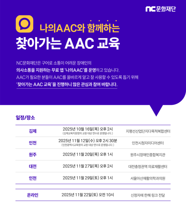 교육 참가를 위해서는 온라인 사전 신청이 필요하며 교육비는 무료다. 신청 방법 등 자세한 내용은 나의AAC 홈페이지에서 확인할 수 있다.