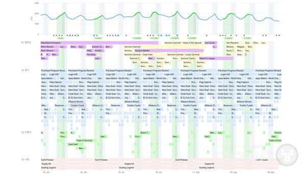이러한 수익화 레이어들은 보통 풍부하고 체계적으로 구성된 라이브오프스 캘린더에 의해 뒷받침된다. 예를 들어 Puzzles & Survival의 이벤트 캘린더를 보면 빈틈이 전혀 없다! 동시에 최대 15개의 정기 이벤트가 진행되며, 시즌 마일스톤과 각종 비정기·일회성 이벤트가 더해진다. 이러한 강도 높은 이벤트 조합은 단순히 잔존율을 유지하는 것뿐 아니라, 이를 수익으로 전환하기 위해 설계된 것이다.