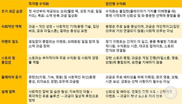 개발사들이 수익화를 다루는 방식은 크게 두 가지로 나뉜다. 일부는 즉각형 수익화에 집중해, 플레이어의 초기 세션부터 적극적인 지출을 유도하면서 LTV 성장을 동시에 지원한다. 반면 다른 일부는 수익화 압박을 늦추어 플레이어의 조기 이탈을 방지하고, 장기적인 지출 잠재력에 초점을 맞춘 점진형 전략을 선택한다.