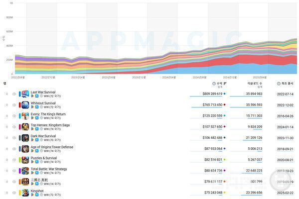 시장 집중도를 보면 상황은 더욱 치열하다. 2023년 이전에는 총수익의 약 40%가 상위 5개 타이틀에 집중되어 있었다. 2024년에 Last War: Survival과 Whiteout Survival이 등장한 이후, 상위 5개의 비중은 더 커져 올해는 이미 50%에 도달했다. 메시지는 분명하다. 진입 장벽은 점점 높아지고 있으며, 상위 20위에서 멀어질수록 수익 잠재력은 낮아진다.