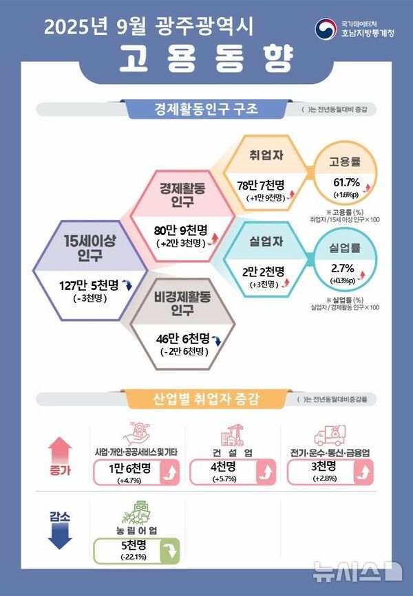 뉴시스 보도에 따르면, 9월 광주 취업자 수가 지난해 같은 달에 비해 증가한 반면, 전남은 감소한 것으로 나타났다.
