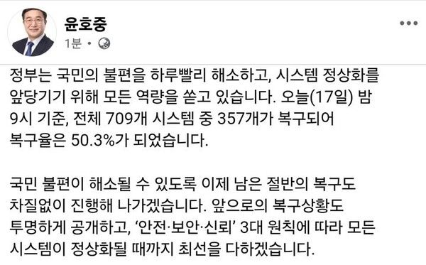 뉴시스 보도에 따르면, 윤 장관은 이날 페이스북에 "오늘(17일) 밤 9시 기준 전체 709개 시스템 중 357개가 복구돼 복구율은 50.3%가 됐다"고 밝혔다.