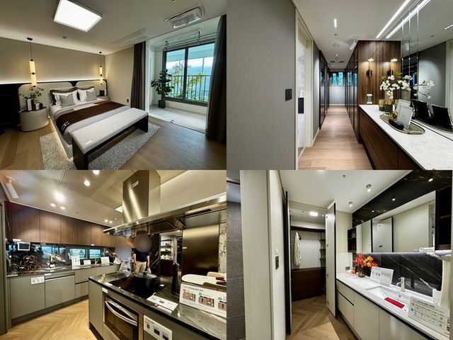거실과 맞닿은 주방은 기본 'ㄷ자형' 구조지만, 전시 유니트는 유상옵션이 적용된 '=자형' 주방을 선보였다. 이 경우 조리대와 식탁이 나란히 배치돼 다이닝존의 개방감이 커지고, 거실과의 연결감도 강화된다. 또한 비스포크 냉장고와 빌트인 김치냉장고, 오븐이 일체형으로 구성돼 수납 효율이 높았다.