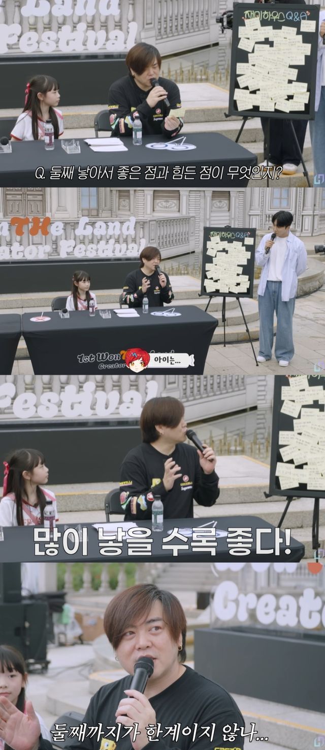 17일 유튜브 채널 ‘재미하우스’에는 ‘재미하우스에도 셋째 소식이..?! 4년 만에 하는 재미하우스 팬미팅!’이라는 영상이 게재됐다. 팬미팅에서 문희준은 ‘둘째를 낳고 좋은 점과 힘든 점이 무엇이냐’는 포스트잇 질문을 직접 뽑아 들었다.