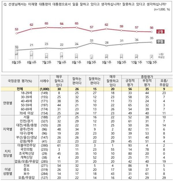 한국갤럽이 지난 14~16일 전국 만 18세 이상 1001명을 대상으로 조사해 17일 발표한 결과에 따르면 이 대통령의 직무 수행에 대해 '잘하고 있다'는 응답은 54%, '잘못하고 있다'는 응답은 35%로 나타났다. 긍정 평가는 직전(9월 23~25일) 조사보다 1%포인트(p) 낮아졌으며, 지난 6월 취임 이후 최저치다. '의견 유보'는 10%였다.