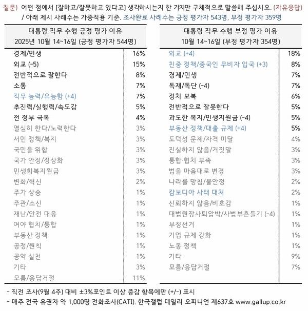 갤럽은 "추석 전에는 조희대 대법원장 사퇴 압박, 내란 재판부 변경 등 여당 주도 사안이 부정 평가 이유로 언급됐지만, 이번에는 외교·중국·부동산 관련 지적이 늘었다"고 분석했다. 이어 "지난달 29일 시작된 중국인 무비자 입국, 연휴 기간 부각된 캄보디아 내 한국인 납치·구금 사태, 10·15 주택시장 안정화 대책 영향으로 보인다"며 "다만 부동산 대책은 조사 후반에 발표돼 향후 반향을 지켜봐야 한다"고 덧붙였다.