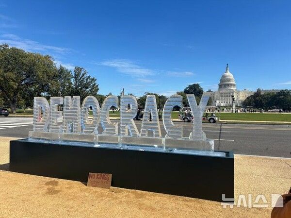 미국 워싱턴 D.C. 국회의사당 인근 공원 내셔널몰에 '민주주의'라는 글자가 새겨진 얼음 조각상이 설치됐다.