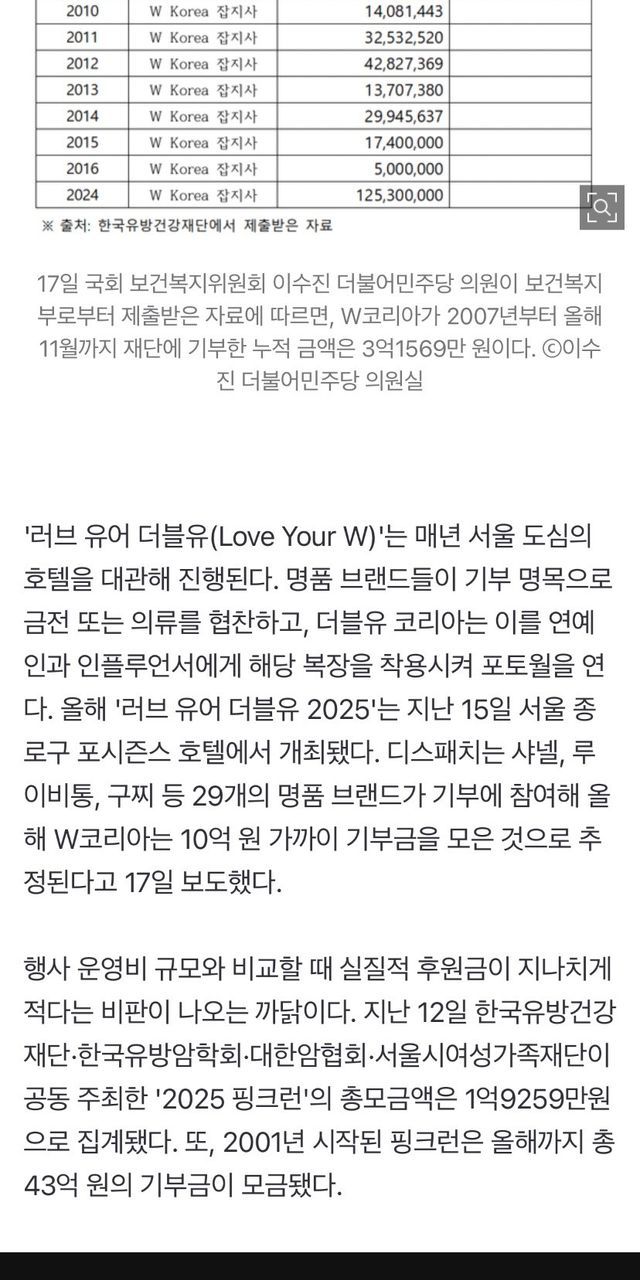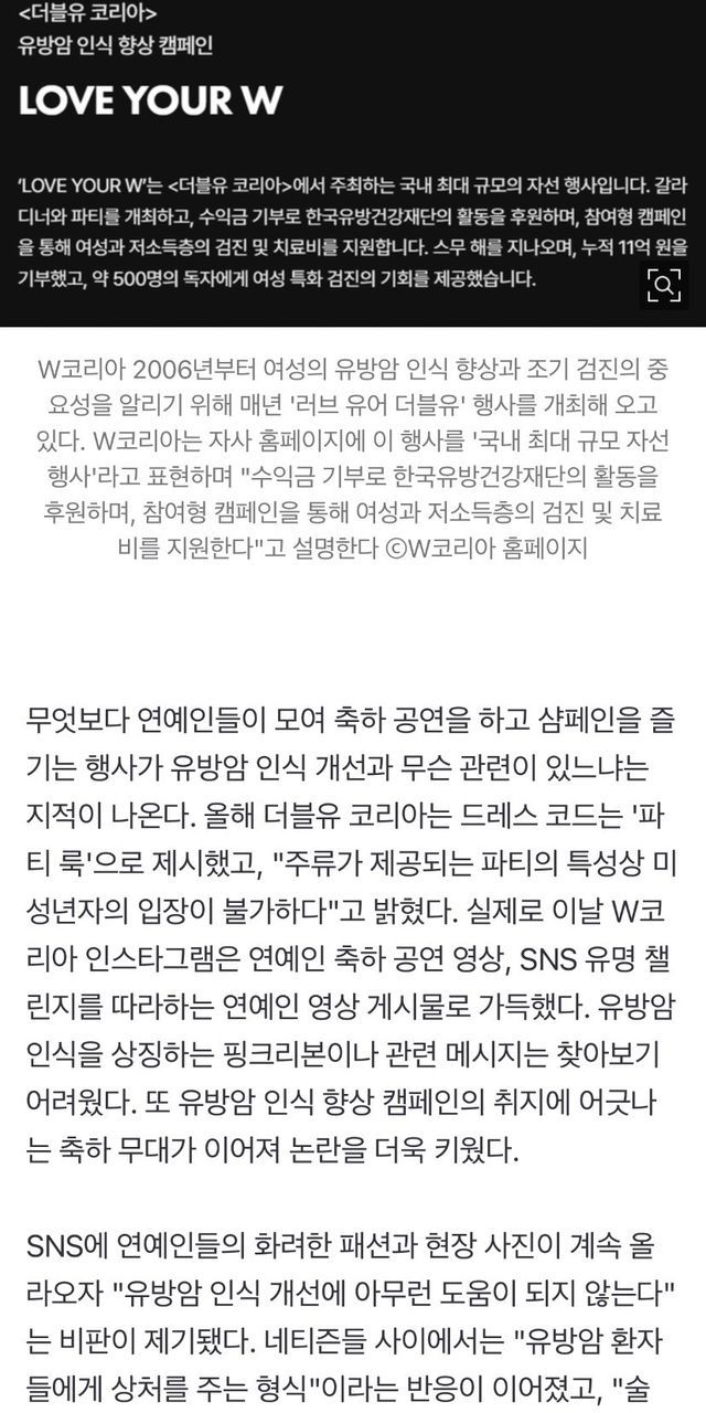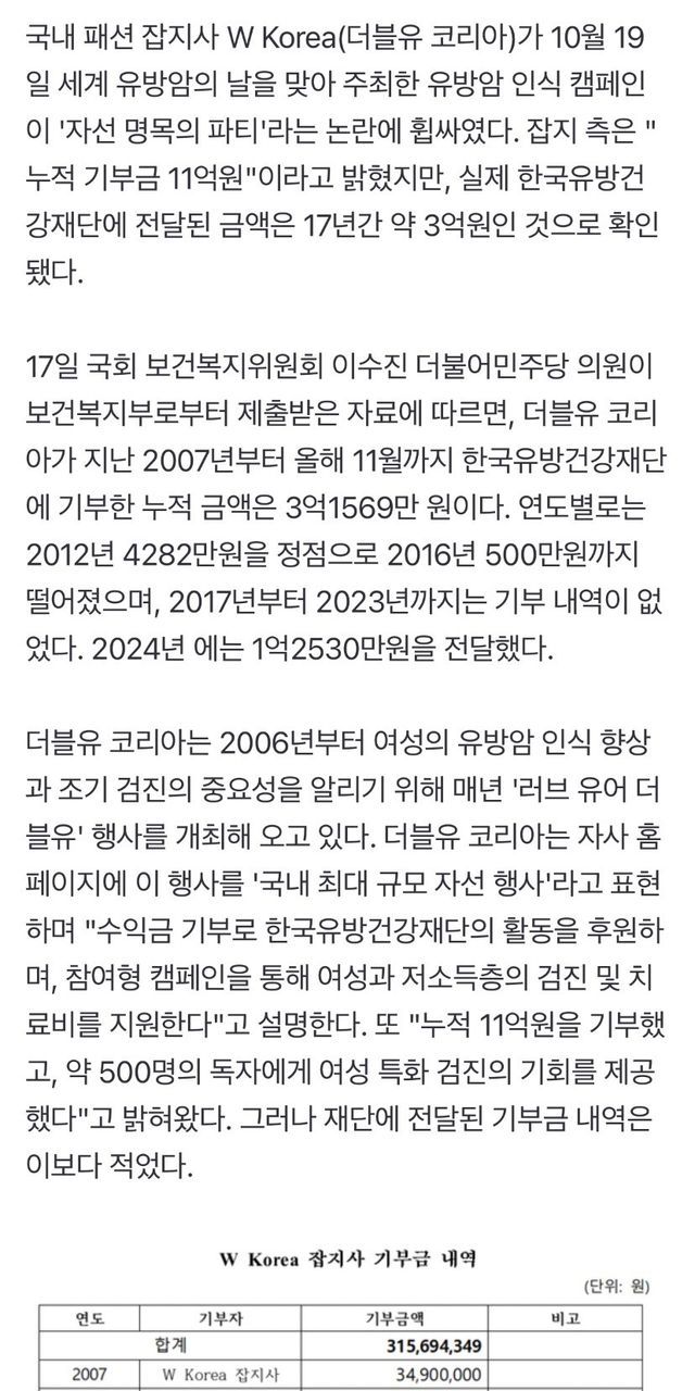 '유방암 자선행사 논란' W코리아, 17년간 한국유방건강재단에