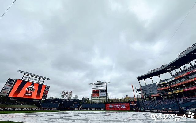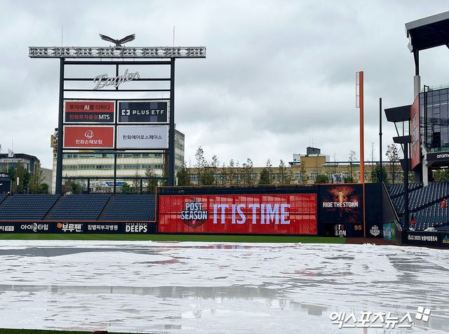 하지만, 양 팀의 18년 만의 가을야구 맞대결은 심술 궂은 가을비로 무산됐다. 지난 17일 오후 4시부터 대전 한화생명볼파크에 부슬비가 내리기 시작했다. 오후 5시를 넘어 빗줄기가 더 강해지면서 내야에 대형 방수포가 깔렸다.