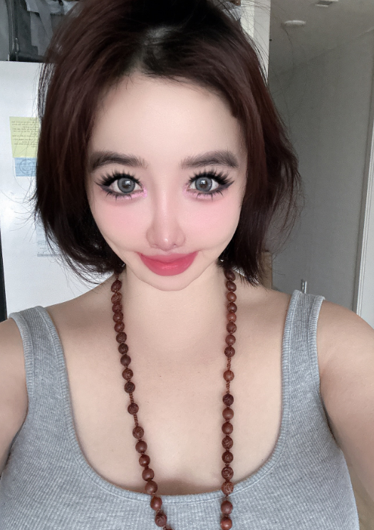단발 헤어스타일과 더불어 눈길을 끄는 건 진하게 강조된 눈매다. 만화 주인공처럼 커다란 눈망울로 카메라를 응시하고 있다. 도자기처럼 매끈한 피부도 인상적이다.