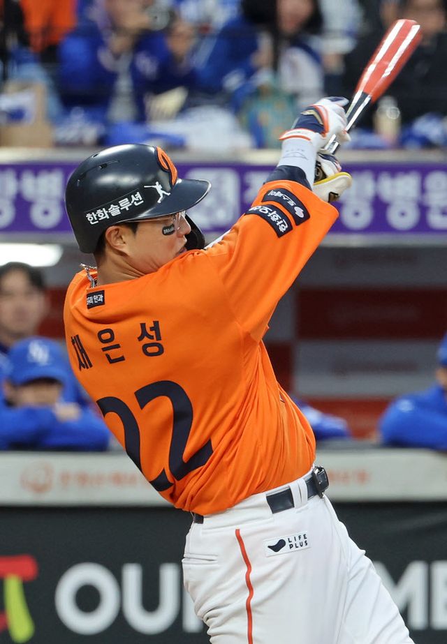 채은성은 18일 대전 한화생명 볼파크에서 열린 삼성라이온즈와 프로야구 2025 KBO 포스트시즌 플레이오프(PO·5전3승제) 1차전에 5번 타자 1루수로 선발 출전해 5타수 3안타 3타점 맹타를 휘둘렀다.