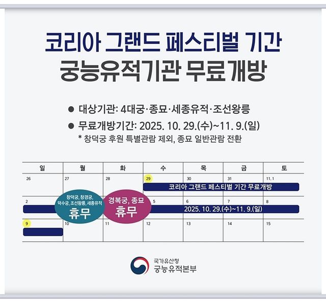 '코리아 그랜드 페스티벌' 기간 궁능 유적 기관 무료 개방 안내 이미지. 10월 말 열리는 '코리아 그랜드 페스티벌' 행사에 맞춰 서울의 주요 궁궐과 왕릉이 무료로 시민들과 관광객들에게 개방된다. 17일 국가유산청에 따르면 궁능유적본부는 10월 29일부터 11월 9일까지 경복궁·창덕궁·덕수궁·창경궁 등 4대 궁과 종묘, 조선왕릉, 세종대왕유적을 무료로 개방한다. 경복궁과 종묘는 화요일인 11월 4일, 창덕궁·창경궁·덕수궁·조선왕릉·세종대왕유적은 월요일인 11월 3일 등 기존 휴관일에는 문을 닫는다. / 국가유산청 궁능유적본부 제공