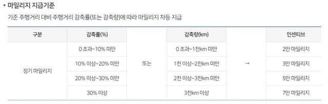승용차 마일리지는 전년도 대비 주행거리를 얼마나 줄였는지에 따라 인센티브가 달라진다. 감축률이나 감축량 중 운전자에게 유리한 기준이 적용되며, 최소 2만 포인트에서 최대 7만 포인트까지 지급된다. 예를 들어 주행거리를 1천㎞ 이상 줄이면 3만 포인트, 3천㎞ 이상 줄이면 7만 포인트를 받을 수 있다.