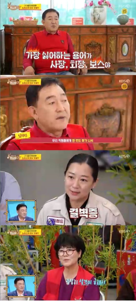 이날 임채무는 "제가 제일 싫어하는 용어가 사장, 회장, 보스다. 한 번도 직원들에게 화가 나서 성내본 적이 없다"고 말했다.