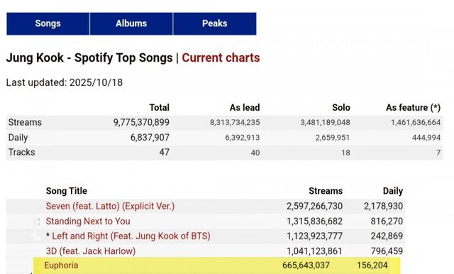 방탄소년단(BTS) 정국의 솔로곡 ‘Euphoria’가 스포티파이(Spotify)에서 6억 6000만 스트리밍을 돌파하며 또 하나의 금자탑을 세웠다.