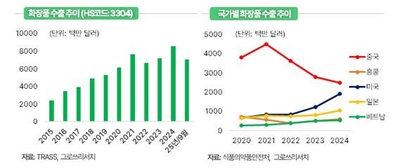 뉴시스 보도에 따르면, 한용희 그로쓰리서치 연구원은 20일 "한국 화장품 수출액은 2012년 10억 달러를 돌파한 이후 꾸준히 증가해 지난해 102억 달러를 기록했다"며 "수출 중심축도 중국에서 미국으로 이동하는 추세"라고 밝혔다.
