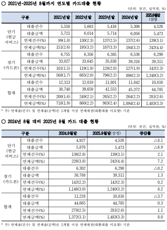 전체 카드 대출액(44조 7850억 원) 대비 연체율은 3.3%를 기록했다.