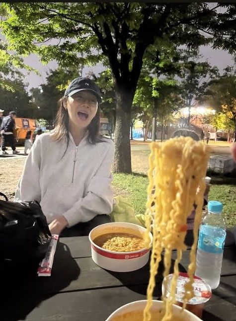공개된 사진 속 그는 모자를 눌러 쓴 편안한 차림으로 한강 공원에서 입을 크게 벌리고 있다.