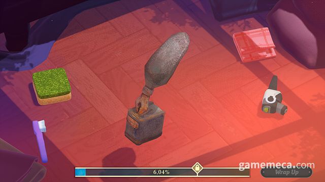 청소 과정은 크게 어렵지 않습니다. 처음부터 '칫솔'이 주어지며, 이를 들고 더러운 사물을 문지르면 됩니다. 검은색으로 더러워진 추억의 물건들은 칫솔로 문지를 때마다 과거의 모습을 드러내며, 그 과정에서 아도라와 가족의 기억들도 하나씩 재생되죠. 메뉴 하단에는 진행도가 표시됩니다. 모든 곳을 꼼꼼하게 닦아 100%까지 도달하는 것이 목표지만, 99%만 달성하더라도 다음 스토리를 감상할 수는 있습니다.