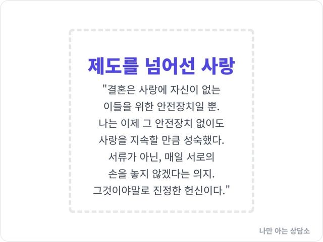 서류 한 장에 기대는 안일한 관계가 아니라, 매일의 삶 속에서 서로의 손을 놓지 않겠다는 의지. 그것이야말로 법적 구속을 뛰어넘는, 가장 숭고하고 헌신적인 파트너십의 증명이다.