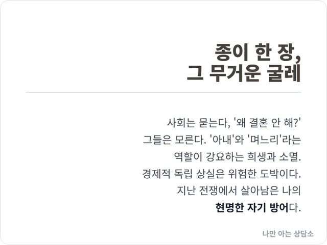 하지만 그 ‘결혼’이라는 단어가 튀어나오는 순간, 당신의 심장은 설렘 대신 차가운 쇠붙이의 감촉을 느낀다. 머릿속으로 구청 창구의 서늘함, 혼인신고서라는 종이 한 장이 가져올 삶의 무게, 그리고 다시 한번 ‘며느리’와 ‘아내’라는 이름의 갑옷을 입어야 한다는 압박감이 스쳐 지나간다.