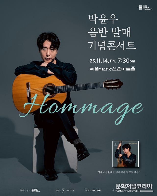 문화저널코리아 김영일 기자 | ‘클래식 기타로 이울어낸 서사’‘비로소 성취해낸 완성형의 내밀한 사운드’‘한국 재즈의 가장 주목할만한 성과중 하나’라는 극찬을 받고 있는 한국 재즈계를 대표하는 낭만 기타리스트, 박윤우가 11월 14일 금요일 예술의 전당 인춘아트홀을 시작으로 15일 토요일에는 김해의 복합문화공간 "음악이주는 선물", 그리고 16일 일요일에는 세종시의 독보적인 재즈 공연장 "재즈인랩"에서정규 3집이자 첫번째 정규 솔로 기타 작품집인<Hommage>음반발매 기념 투어를 한다.