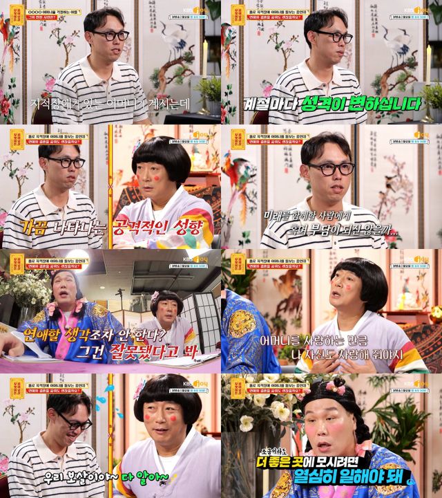 어머님의 상태가 어떻냐는 질문에, 계절마다 성격이 변하신다며 “몸 전체에 대상포진이 와도 말하지 않으실 정도로 조용할 땐 너무 조용하시고, 말씀이 많으실 때는 외출을 자주 하는데 가끔은 공격적인 성향도 보이신다”라고 밝혔다. 아버지는 사연자가 15살 때 세상을 떠나셨고, 지금은 할머님도 돌아가신 상황에 외동인 그는 “어머니에겐 제가 전부”라고 털어놓았다.