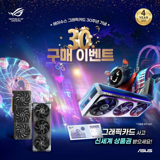 에이수스 코리아는 그래픽카드 출시 30주년을 기념해 ROG, TUF, PRIME 라인업 그래픽카드 구매 고객을 대상으로 상품권 증정 이벤트를 진행한다.