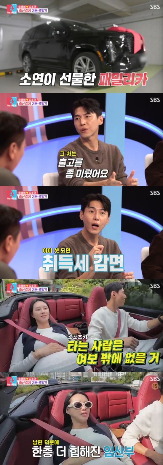 이날 송재희와 지소연은 쌍둥이 출산을 위해 병원으로 향했다. 지난 방송에서 공개된 패밀리카를 두고 스포츠카에 몸을 싣는 지소연의 모습에 송재희는 "다둥이 혜택이 크더라. 아이가 셋이면 면세가 되고, 취득세가 엄청 감면된다. 그래서 출차를 미뤘다"고 설명했다.