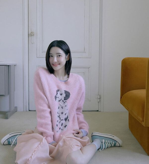사진 속 박지현은 무릎을 꺾고 앉아있다.