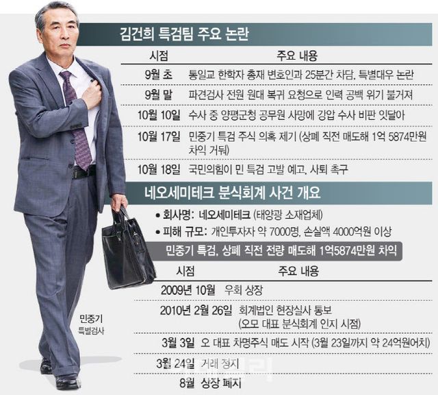 타이밍이 묘하다. 네오세미테크 대표였던 오씨는 민 특검과 대전고·서울대 동기다. 오씨는 분식회계가 드러날 것을 알고 차명 주식을 매도하고 도피한 혐의로 징역 11년형을 받았다. 민 특검의 주식 처분 시점도 같다.