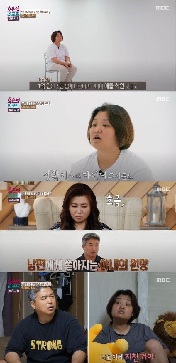 아내는 "지금 재정 상태가 좋지 않아서 남편의 수익으론 생활비가 모자랐다"며 "(제 연봉으로) 1억원 조금 넘게 나오니까 그나마 아이들 학원 보내고, 이자랑 세금도 내는 것"이라고 했다.