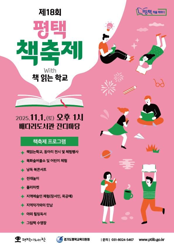 평택시(시장 정장선)의 대표 시민독서운동 ‘평택, 책을 택하다’ 「2025 평택 책축제 with 책 읽는 학교」가 오는 11월 1일 토요일 오후 1시 배다리도서관 잔디마당에서 개최된다.
