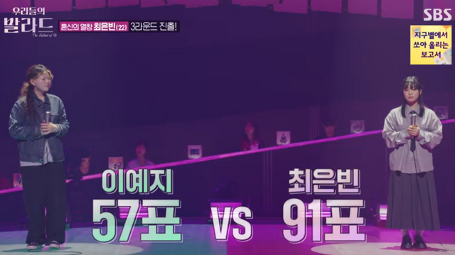 21일 방송된 SBS 오디션 예능 ‘우리들의 발라드’ 5회에서는 ‘이별’을 키워드로 한 2라운드 무대가 펼쳐졌다. 이날 참가자들은 1대1 맞대결을 펼쳤고, 1라운드 전체 득표 1위의 이예지와 3위의 최은빈이 맞붙었다.