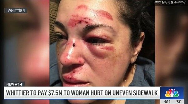 뉴시스 보도에 따르면, 17일(현지시각) 미 NBC로스앤젤레스에 따르면 특수교사인 저스틴 구롤라라는 여성은 2018년 2월 미 캘리포니아주 휘티어시에서 조카와 함께 인도를 걷다가 튀어나온 보도블록에 걸려 넘어졌다.