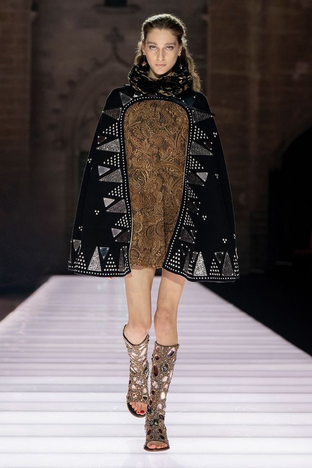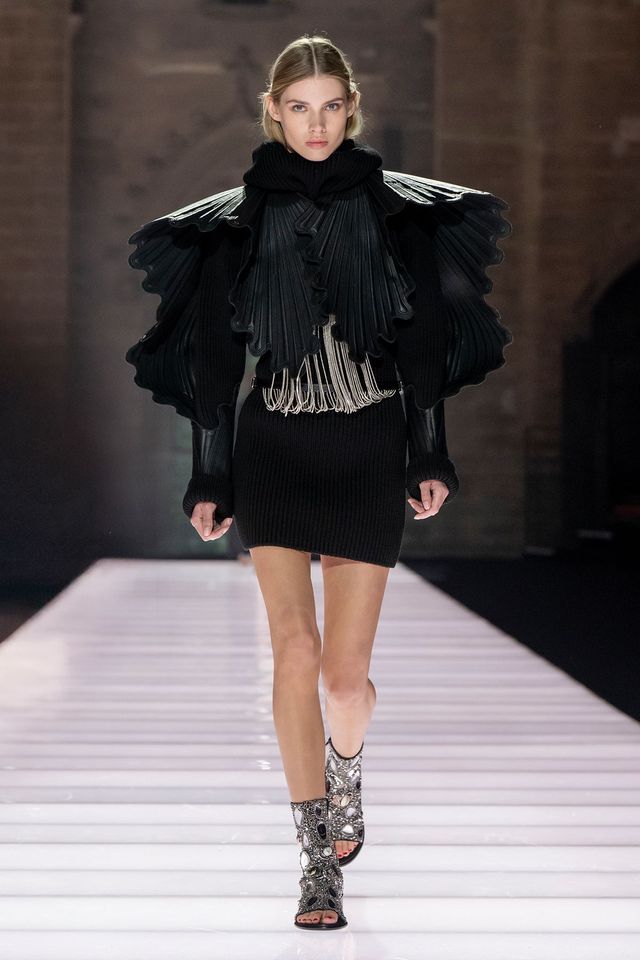 컬렉션은 시간의 층위를 자유롭게 넘나들었다. 화려한 브로케이드 재킷은 시어링 장식으로 마무리되어 중세의 웅장함과 현대적 세련미를 동시에 품었고, 레그오브머튼 슬리브와 풍성한 셔츠는 과거의 형태를 빌려 미래적 실루엣을 그려냈다. 특히 표면 질감에 대한 실험은 촉각적 경험을 시각적 스펙터클로 승화시켰다. 발가락 부분이 절개된 보석 장식 부츠는 수많은 거울과 귀한 소재로 빛났고 블라우스는 섬세한 은빛 체인 실로 짜여 빛의 움직임에 따라 살아 숨 쉬었다.