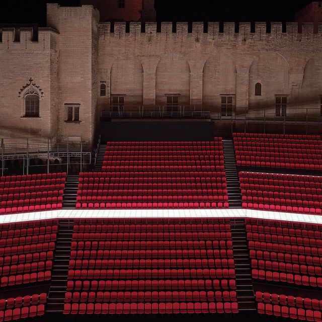 14세기 교황청(Palais Des Papes)의 중앙 안뜰 ‘쿠르 도뇌르(Cour D’Honneur)’. 유네스코 세계문화유산인 이 신성한 공간에서 루이 비통이 브랜드 역사상 처음으로 2026 크루즈 여성 컬렉션 패션쇼 무대를 열었다. 700년의 침묵을 깨고 울려 퍼진 것은 기도가 아닌 패션의 선언이었다. 세트 디자이너 에스 데블린이 설계한 무대는 그 자체로 하나의 철학적 성찰이었다. 붉은 벨벳으로 된 계단식 극장 좌석은 텅 빈 채로 층층이 솟아올랐고 관객들은 오히려 무대 쪽에 배치되어 교회 벤치를 연상시키는 나무 의자에 앉았다. 관객과 무대의 경계가 해체되는 순간, 우리는 모두 이 거대한 연극의 일부가 되었다.