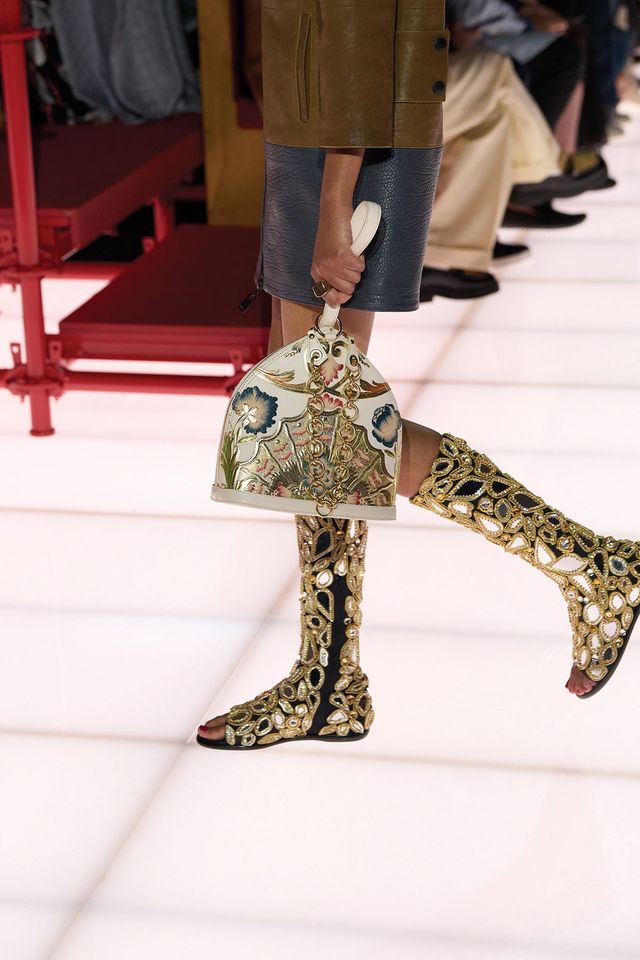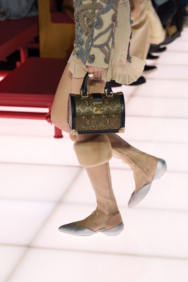 1930년대에 처음 선보인 루이 비통의 클래식 아이콘 ‘알마’ 백 역시 이번 2026 크루즈 컬렉션에서는 전혀 새로운 얼굴을 하고 무대에 올랐다. 희귀 고서의 표지에서 볼 법한 황금빛 3D 장식이 가미된 알마 백은 ‘필사본 장식(Manuscript Illumination)’을 연상시키며, 단순한 액세서리를 넘어 지식과 예술, 그리고 시간의 축적에 대한 오마주가 되었다. “역사를 바라보지만, 역사적이진 않아요.” 제스키에르의 이 말은 이번 쇼의 알마 백에 고스란히 담긴 철학을 압축한다. 그는 아서왕 전설에서 글램 록의 아이콘 데이비드 보위, 그리고 하임 자매에 이르기까지 폭넓은 레퍼런스를 엮어내며 과거와 현재, 미래를 하나의 연속체로 직조했다.
