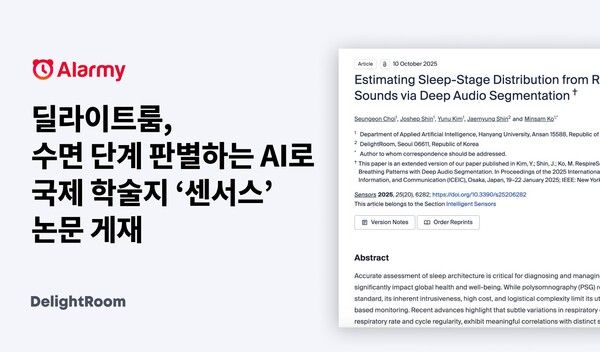 글로벌 수면-기상 솔루션 '알라미'를 운영하는 딜라이트룸(대표 신재명)이 수면 호흡을 정밀하게 분석해 수면 단계를 판별하는 인공지능(AI) 모델 연구 성과를 발표하며 슬립테크 시장에서 기술력을 입증했다. 해당 연구 논문은 센서 기술 분야의 권위 있는 SCI급 국제 학술지 '센서스'(Sensors)에 게재되어 주목받고 있다.