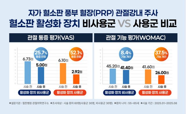이에 힘찬병원 관절의학연구소는 2025년 1월부터 8월까지 무릎 관절염으로 자가 혈소판 풍부 혈장 관절강내 주사 치료를 받은 환자 60명(나이 55~65세)을 혈소판 활성화 장치 사용군과 비사용군으로 나눠, 시술 전후 치료 효과를 비교, 분석했다. 치료 효과는 통증 정도를 나타내는 VAS(Visual Analog Scale), 관절 기능을 평가하는 WOMAC(Western Ontario and McMaster Universities Osteoarthritis Index) 지표를 기준으로 적용했다. VAS 점수는 통증의 강도를 0~10점으로, WOMAC 점수는 관절 기능을 0~96점으로 평가하며, 둘 다 점수가 낮을수록 개선됨을 의미한다.