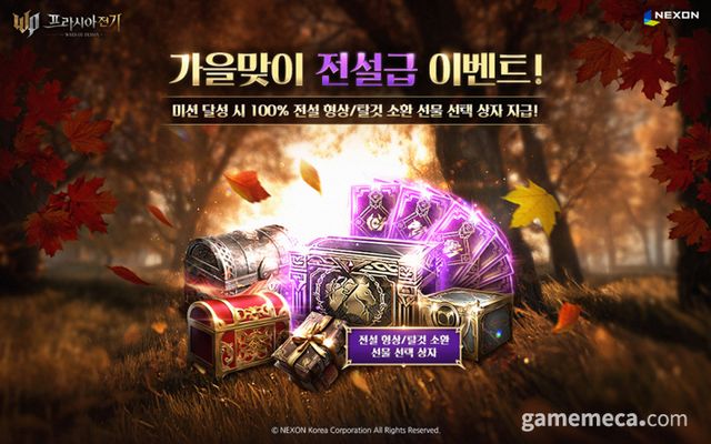 또, 11월 19일까지 하늘이 높아지는 계절 제전 이벤트에서 몬스터 처치, 장비 제작, 보스 레이드 클리어 등 미션을 수행하면 전설 형상/탈것 소환 선물 선택 상자, 영웅 3종 소환 선물 선택 상자, 찬란한 정령 초월소환 선물(11회) 등을 제공한다.