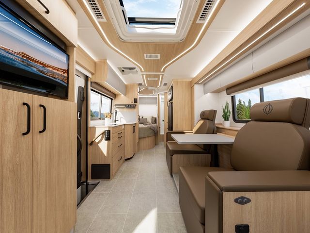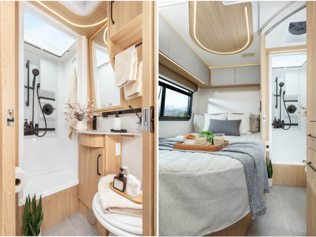 실내의 경우, 다섯 가지 레이아웃 모두 데저트 섀도우 에디션 특유의 색감과 재질을 적용했으며, MBL(Murphy Bed Lounge) 레이아웃이 특히 눈길을 끈다. 이 구조는 침실을 캠핑카 측면 슬라이드아웃에 배치하고, 후면 공간을 욕실로 사용한다. 샤워부스와 독립 화장실, 넓은 세면대가 포함돼 가정 수준의 편의성을 제공한다.