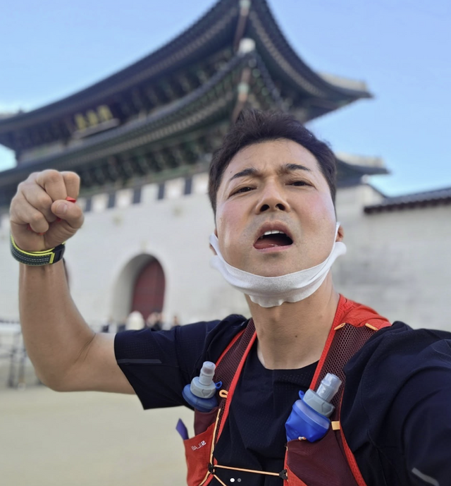 사진 속 전현무는 광화문 앞에서 운동복 차림으로 포즈를 취하고 있다. 얼굴에는 땀방울이 맺혀 있고, 수분 보충용 물통이 달린 러닝 베스트를 착용한 모습이 눈길을 끈다.