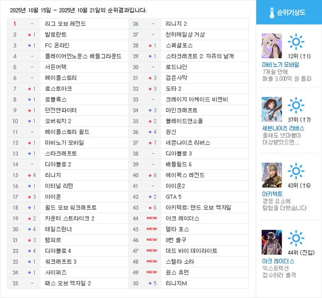 하위권에서는 22일 정식 서비스를 시작한 ‘아키텍트: 랜드 오브 엑자일(이하 아키텍트)’이 6계단 상승하며 43위에 자리했다. 리니지2 레볼루션 등을 개발한 박범진 사단의 MMORPG 신작으로, 경쟁과 더불어 비행 등 특수 이동을 활용한 탐험을 특징으로 앞세웠다. 출시 전날에 시작한 캐릭터 사전 생성은 당일 3차까지 마감되어 4차가 열렸을 정도로 많은 유저들이 몰렸다. 신작 릴레이로 경쟁이 과열된 MMORPG 시장에서 아키텍트가 두각을 드러낼 수 있느냐가 관심사로 떠오른다.