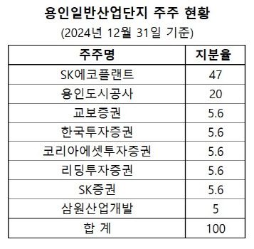 용인일반산업단지의 최대주주는 지분 47%를 보유한 SK에코플랜트며, 사업의 대표 시공사도 SK에코플랜트다. 그 다음으로 지분율이 높은 주주는 용인도시공사(지분율 20%)다.