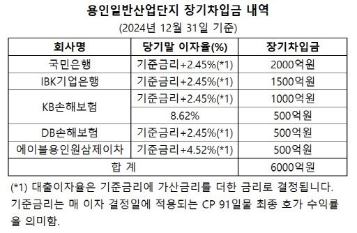 각 차입처별 대출금액은 △KB국민은행 2000억원 △IBK기업은행 1500억원 △KB손해보험 1500억원 △DB손해보험 500억원 △에이블용인원삼제이차 500억원이다.