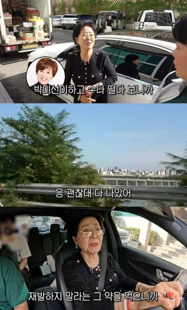 차 안에서 박미선 건강 상태에 대한 질문을 받은 선우용여는 "괜찮대. 다 나았다더라"고 했다.