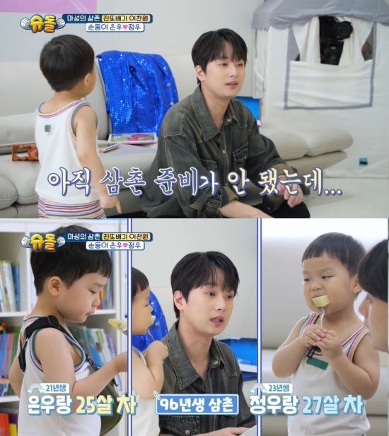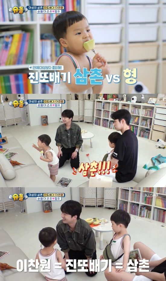 이찬원은 정우에게 "나 삼촌이야 형이야?"라고 물었고, 정우는 "진또배기 삼촌"이라고 외쳤다. '진또배기'가 뭐냐고 묻자 정우는 "삼촌"이라고 쐐기를 박았고, 이어 아빠, 은우를 부르면서 이찬원을 확실하게 '삼촌'으로 못박았다.