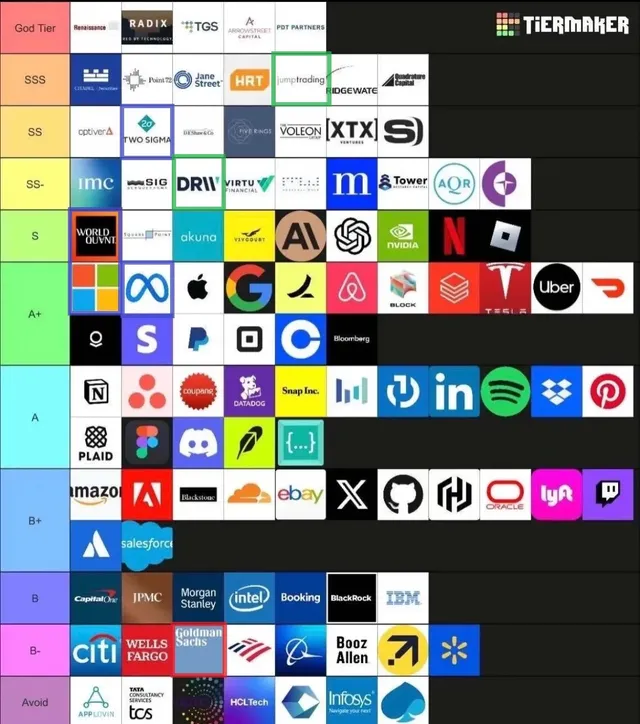 God tier에 분류되는 회사들은 모두 주식투자 자동매매 회사들로, 인턴이 월급 4000만원부터 시작한다고 함 ㄷㄷ