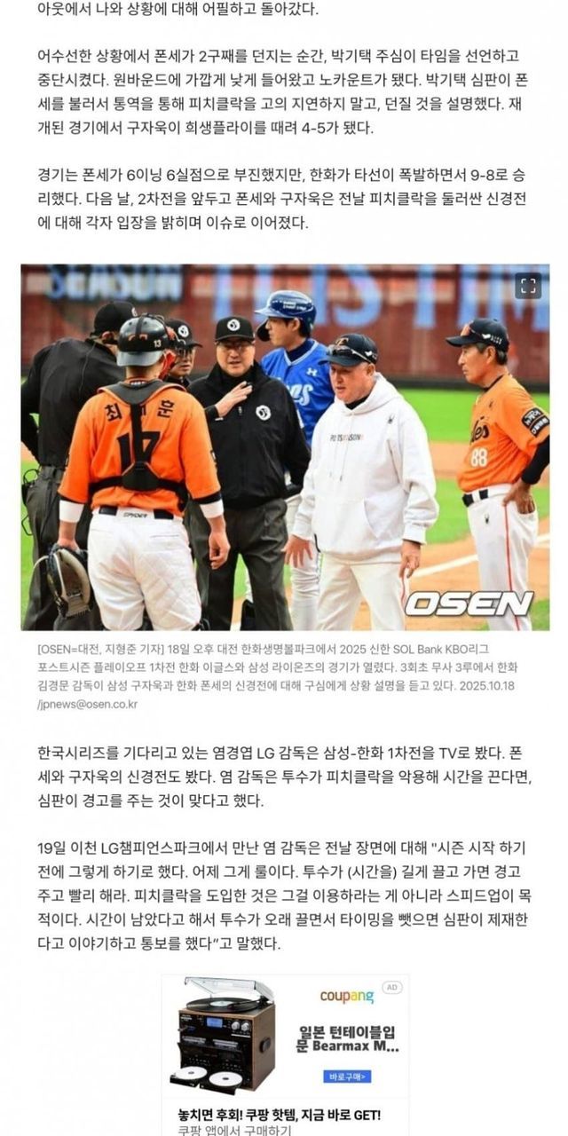 19일 이천 LG챔피언스파크에서 만난 염 감독은 전날 장면에 대해 "시즌 시작 하기 전에 그렇게 하기로 했다. 어제 그게 룰이다. 투수가 (시간을) 길게 끌고 가면 경고 주고 빨리 해라. 피치클락을 도입한 것은 그걸 이용하라는 게 아니라 스피드업이 목적이다. 시간이 남았다고 해서 투수가 오래 끌면서 타이밍을 뺏으면 심판이 제재한다고 이야기하고 통보를 했다”고 말했다.